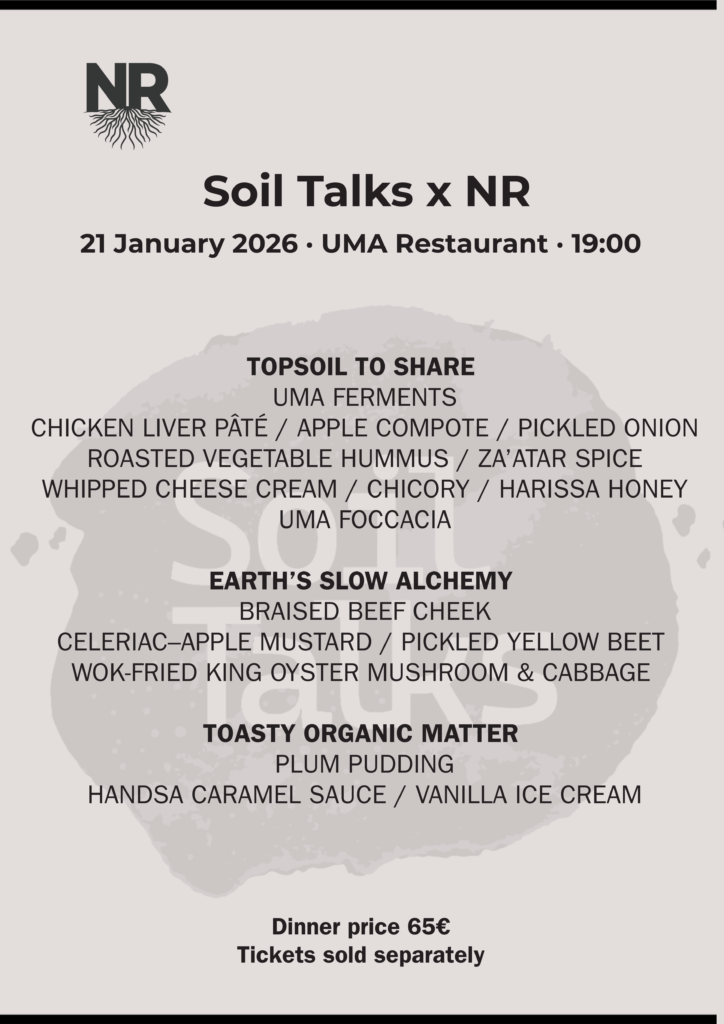 The conversation is followed by A Dinner Rooted in Earth crafted by Chefs Peeter Pihel and Kristo Malm for Northern Roots. Inspired by regenerative agriculture, the menu features shared fermented bites, a comforting slow-cooked main with earthy sides, and a warm, soothing dessert.